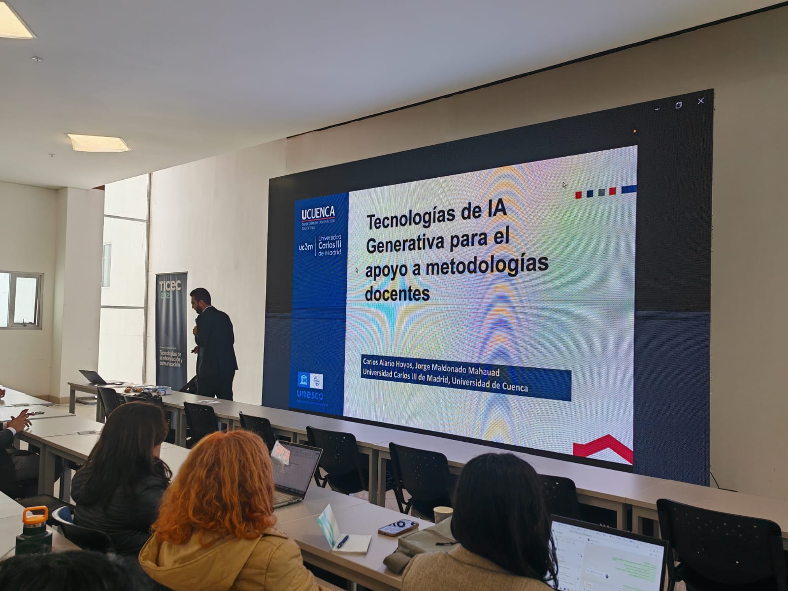 Durante el evento, el Dr. Carlos Alario presenta experiencias y casos de uso sobre la integración de tecnologías educativas con y sin inteligencia artificial en los procesos de enseñanza y aprendizaje.